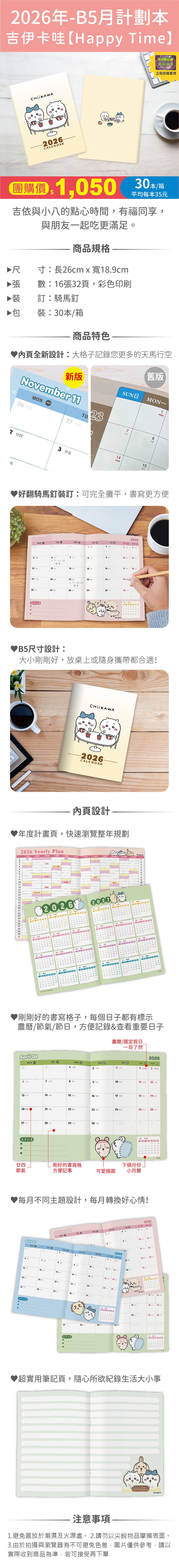 商品詳情 預購商品:預計11月開始出貨 名 稱:【B5月計劃本】吉伊卡哇_Happy Time 尺 吋:長26cm * 寬18.9cm (頁數:16張 32頁,彩色印刷) 數 量:30本(下單每1組為30本,請務必確認訂購組數喔!) 平均每本單價只要$35元呦!